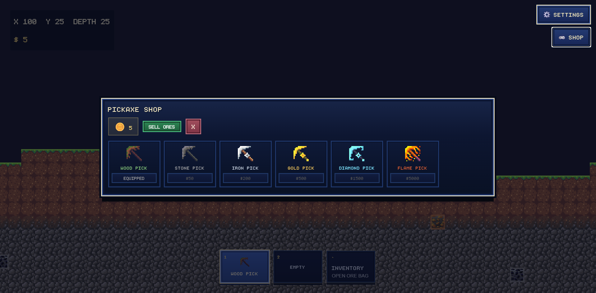 🛠️ Pickaxe Upgrades: Visit the shop to spend your earnings on better pickaxes. Start with a wooden pick and work your way up to the Flaming Pickaxe that melts through solid rock.